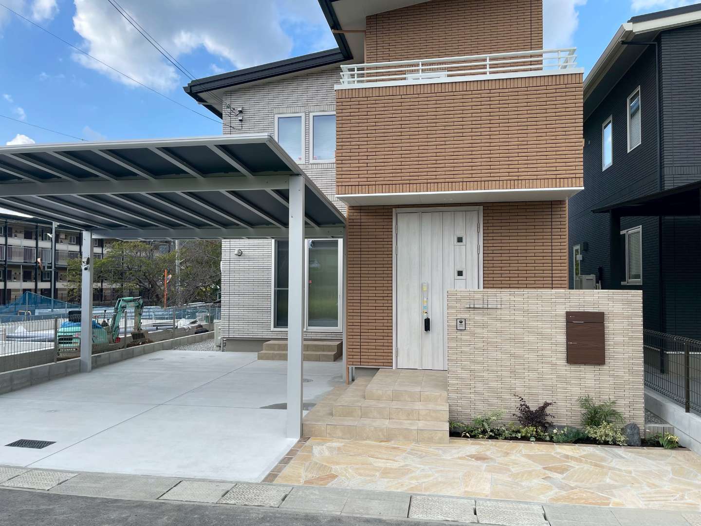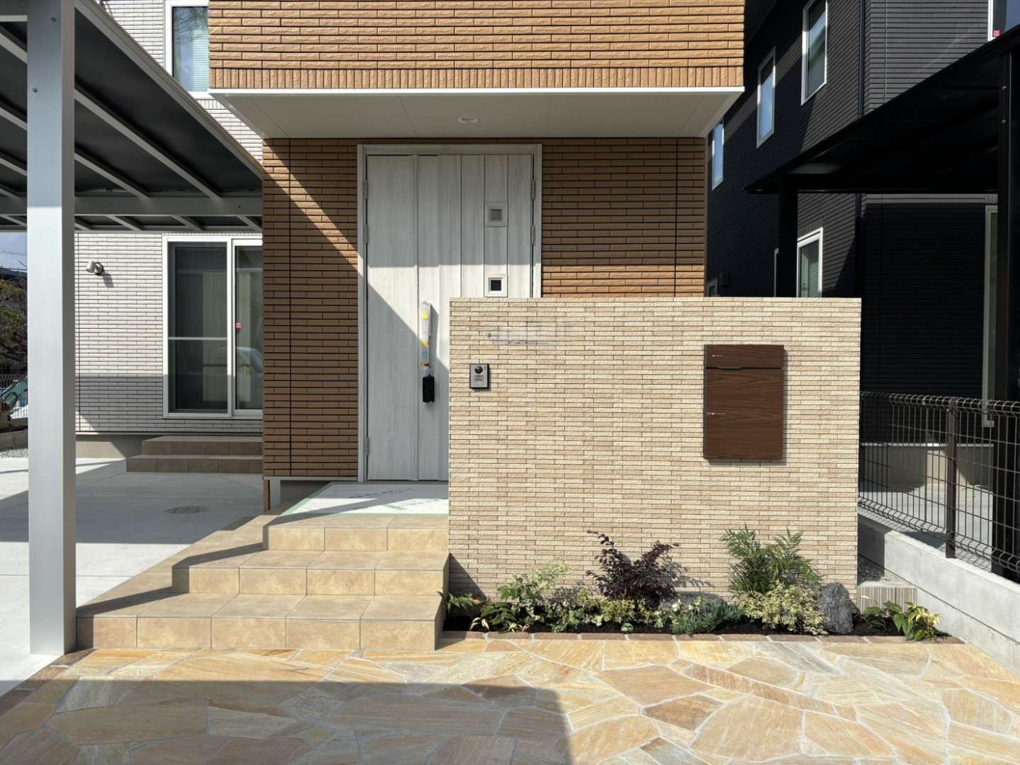 奈良県香芝市のS様邸で外構・エクステリア工事を行いました。 ・土間コンクリート ・門柱(塗装仕上げ) ・表札灯 ・タイルアプローチ ・2…